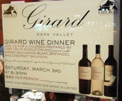 The latest special event held at Cafe Blue was a Private Wine Dinner sponsored by Girard Winery. Importer David Jesperson of WJ Duetsch described the winery, the vineyards and explained the various wines' origins. Chef Kevin's courses were inspired by the wines and envisioned with the pairings in mind.