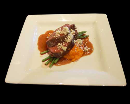 Roasted buffalo tenderloin, cracked black pepper sauce, sweet potato puree, asparagus