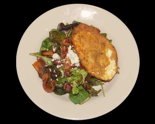 Crispy bacon, mixed greens, blue cheese, reduced balsamic vengar, deep fried egg